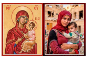 The image on the right is of a mother and child in ruins of Gaza, in one of Israel’s bombing campaigns before 2023. The earliest Christian community, with all Palestinians, is under existential threat in Gaza and the West Bank from the genocide and ethnic cleansing by Israel.